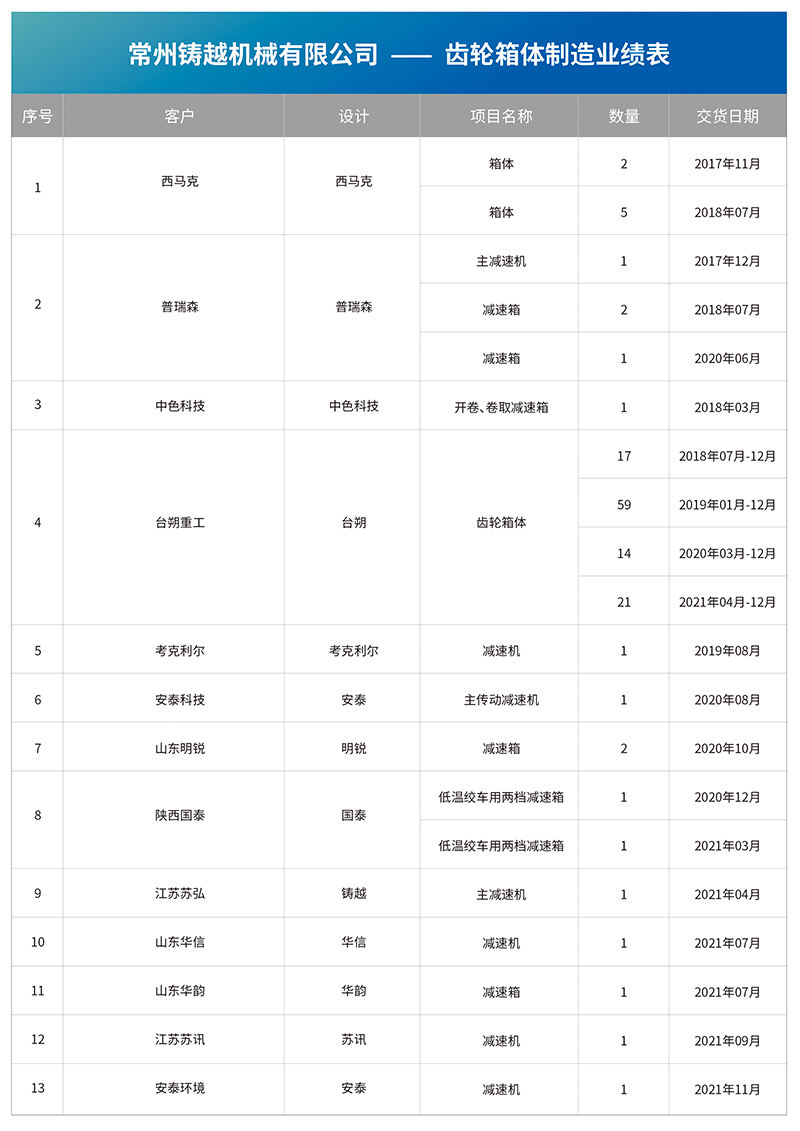 公司主要客戶有西馬克,奧鋼聯(lián),達(dá)涅利CMI及中冶京誠(chéng)、中冶南方、西重所、武漢乾冶、西安普瑞森等世界鋼鐵設(shè)計(jì)公司,同時(shí)也為國(guó)內(nèi)各大鋼廠提供產(chǎn)品和服務(wù),有:寶鋼、沙鋼、淮鋼等。公司憑借雄厚的技術(shù),科學(xué)的管理,先進(jìn)的檢測(cè)手段,制造出質(zhì)優(yōu)價(jià)廉的產(chǎn)品公司始終堅(jiān)持信譽(yù)第一,為國(guó)內(nèi)鋼廠提供一流的產(chǎn)品和服務(wù)。