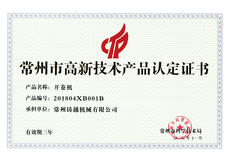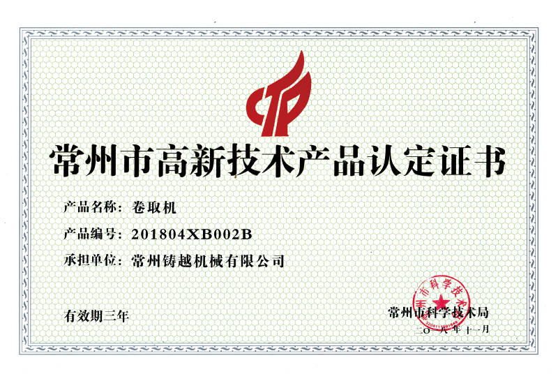 常州市高新技術(shù)產(chǎn)品認(rèn)定證書