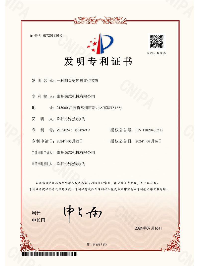 發(fā)明專利證書(shū) —— 一種圓盤剪轉(zhuǎn)盤定位裝置