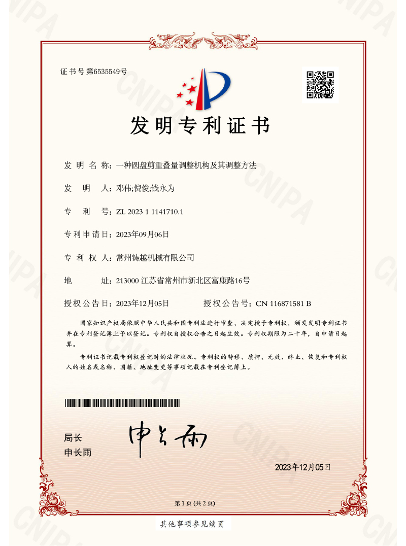 發(fā)明專利證書 —— 一種圓盤剪重疊量調(diào)整機構(gòu)及其調(diào)整方法